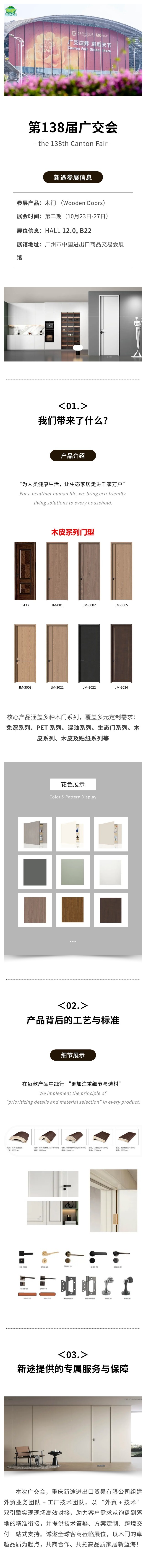 2025年10月23日(广交会第二期),重庆新途进出口贸易有限公司将携高品质木门亮相广交会,以 “外贸 + 技术” 双引擎实现现场高效对接,与各大客商共商合作、共拓高品质家居蓝海!
